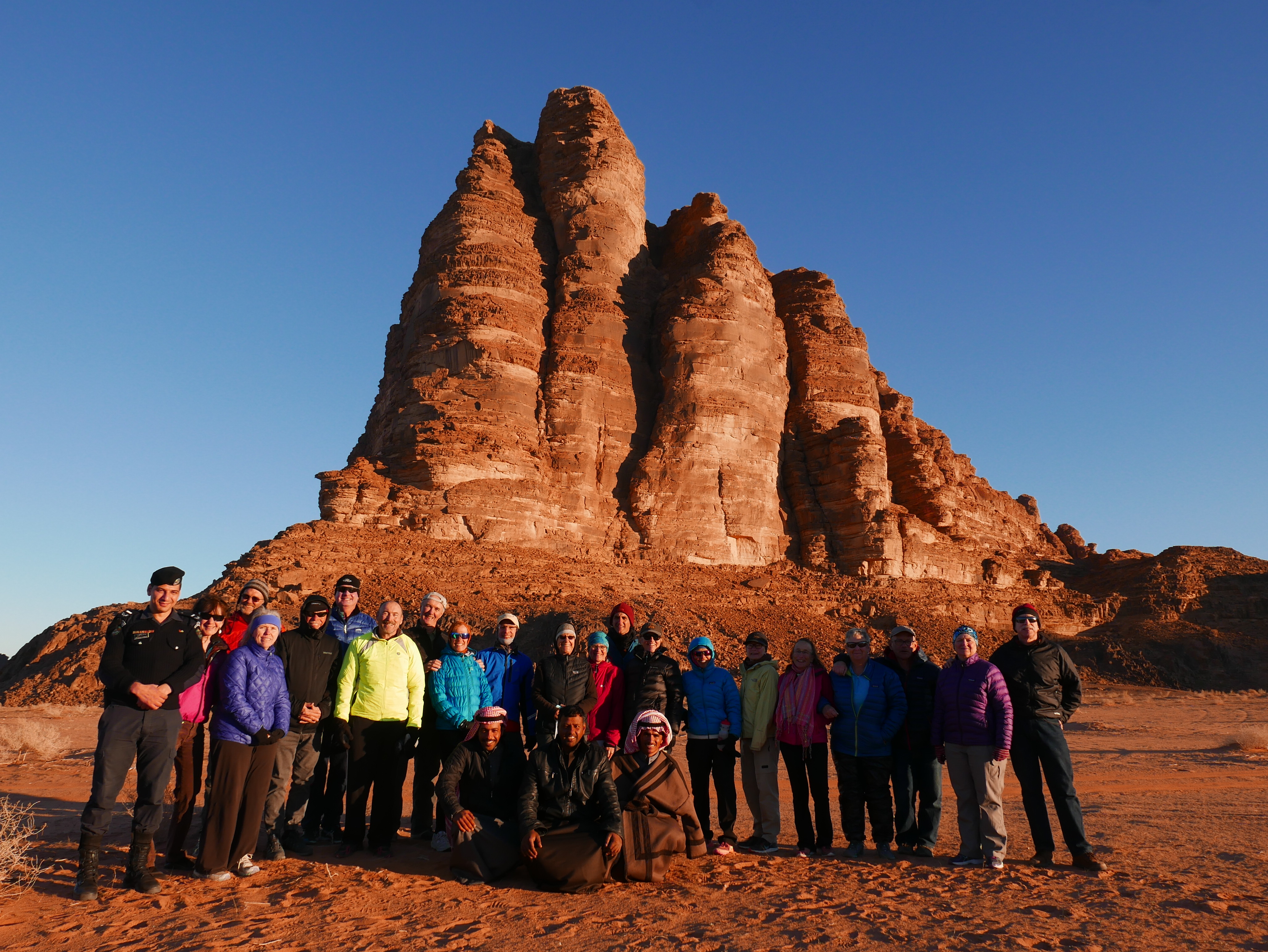 Following morning we rode through Makhtesh Ramon, descending to Kibbutz Lotan, with strong tailwinds - riding 100km, climbing 2500', and descending nearly 5000', a fast metric century. The final ride in Israel, into Eilat mountains, passing "Western Border Crossing", along Egyptian border, with views of the Sinai, continuing for nearly 40km before descending into Eilat and the Red Sea. The next morning we crossed into Aqaba, Jordan and enjoyed a walking tour. Then next morning, Aqaba to Wadi Rum was one tough day - headwinds for the entire 65km and 3200' of climbing. The reward was the stay in a Bedouin camp, enjoying traditional hospitality, and sunset jeep tour of Wadi Rum.